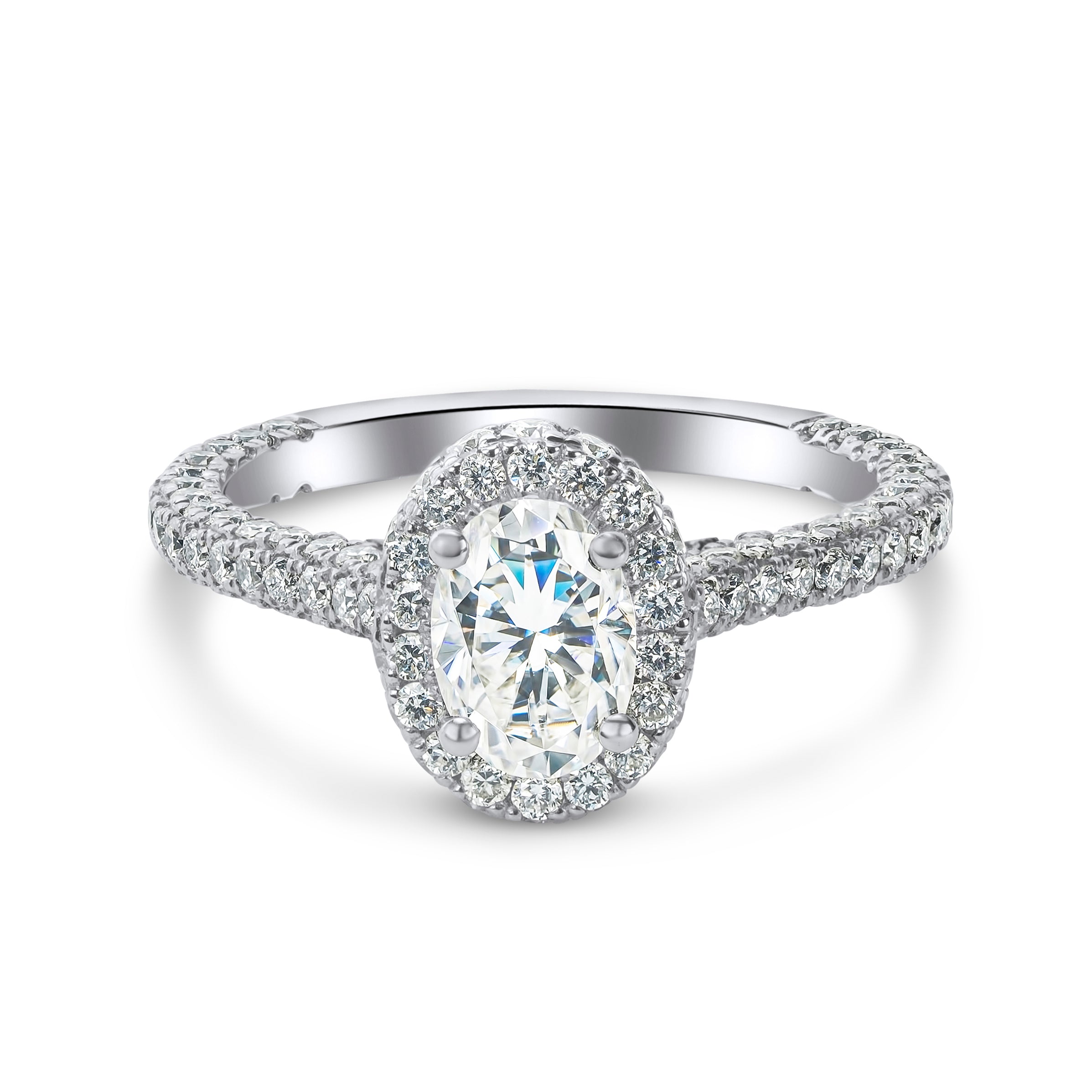 This exquisite platinum engagement ring features a stunning lab-created oval diamond with a total carat weight of 1.90, surrounded by a halo of 130 gemstones that add an extra touch of sparkle. The 3D oval design and micro setting style make for a unique and eye-catching piece, while the adjustable band and engraving options provide a personalized touch. Ideal for any special occasion, this vintage-inspired ring boasts a diamond colour grade of F and a clarity grade of Very Slightly Included (VS1), as certified by IGI. With a seller warranty and the option for wholesale purchase, this handmade ring is a true investment in style and quality.